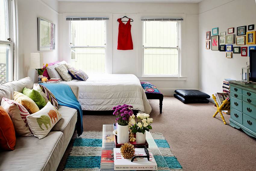 Обдумывая дизайн совмещенной комнаты, следует задуматься не только над тем, как поделить, но и как совместить зал и спальню. Интерьер зон должен быть уникальным, но необходимы и детали, которые будут объединять пространство. С этой задачей хорошо справятся материалы, которые используются в обеих комнатах: портьеры и подушки из одной ткани, светильники из одного металла, разный дизайн ковров, выполненных в одной цветовой гамме.
