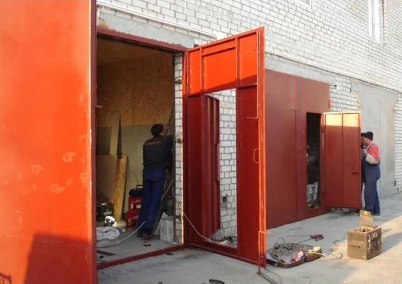 Производство двери ничем не отличается от изготовления секций. Трудности возникают в том, что сама створка должна быть обшита стальным листом. А если нужно сделать дверной проем, то его нужно оставить открытым, а остальное покрыть сталью.