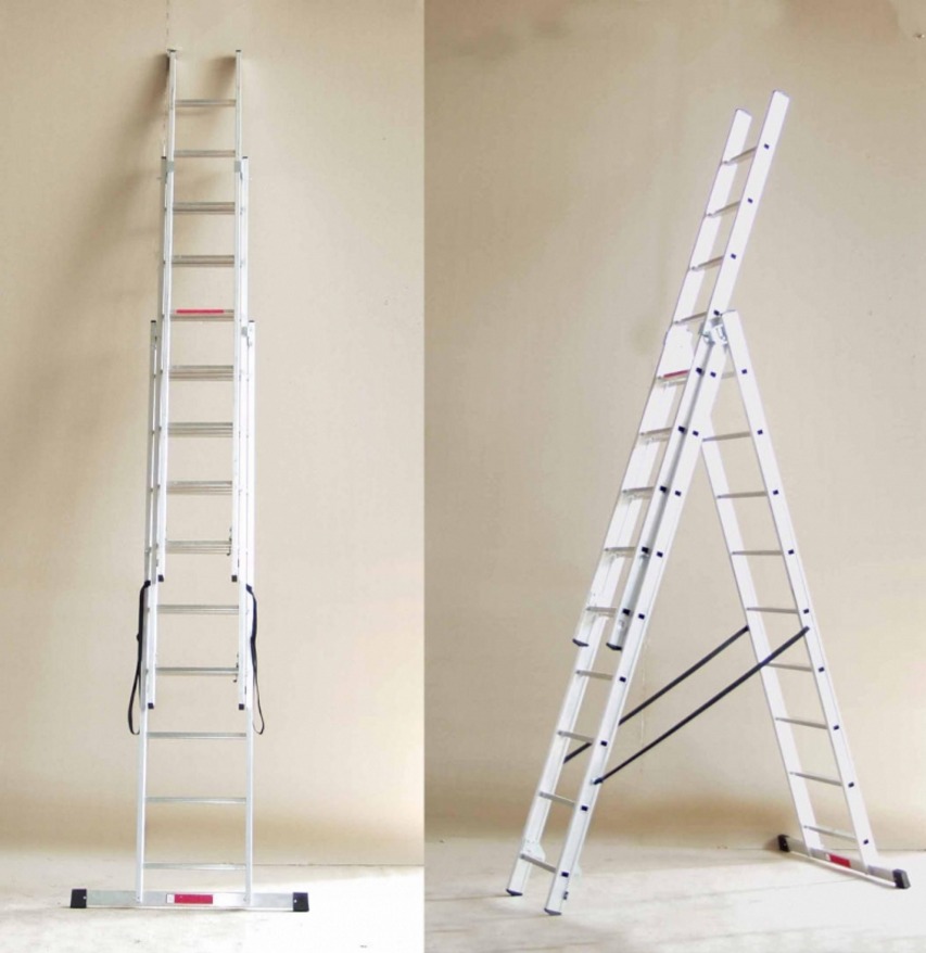 Достаточно популярной является универсальная алюминиевая раскладная 3-х секционная лестница, поскольку она компактная и невероятно легкая