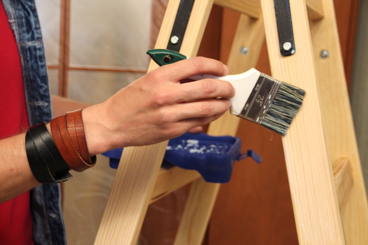 Для того чтобы уберечь стремянку от процесса гниения, на деревянные детали следует нанести антисептическое средство, которое образовывает пленку с водоотталкивающим эффектом. Кроме того, можно покрыть изделие лаковым составом, не касаясь при этом металлических элементов конструкции.