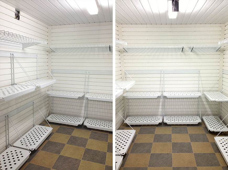 - Обустройство внутреннего пространства, то есть установка стеллажей и ящиков.