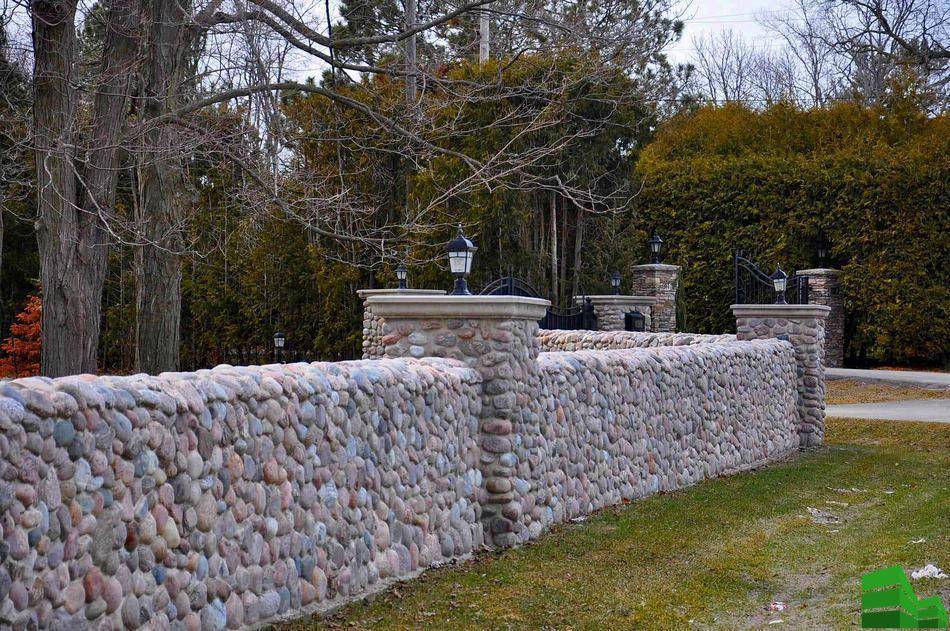 - Любой тип постройки коттеджа будет прекрасно сочетаться с вымощенными булыжником фактурами ограды.