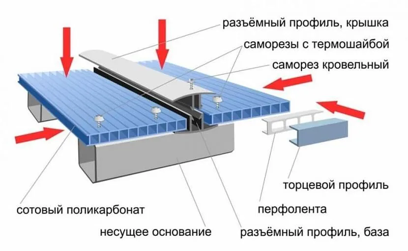 - Поликарбонат нарезают на полотна необходимого размера с помощью электролобзика с полотном для дерева и средним размером зубцов. Защитную пленку во время монтажа не снимают – она предохраняет листы поликарбоната от царапин и других повреждений. На торцы сотового поликарбоната надевают специальные алюминиевые заглушки. Поликарбонат крепят на каркас с помощью саморезов с уплотнительными шайбами.Предварительно просверливают в поликарбонате отверстия с шагом 30-40 см, диаметр отверстия – на 2 мм больше диаметра самореза. При креплении необходимо следить, чтобы поликарбонат не был жестко зажат саморезом, иначе при температурных перепадах он может потрескаться. Также необходимо следить, чтобы между поликарбонатом и другими элементами конструкции был зазор, необходимый для температурного расширения.