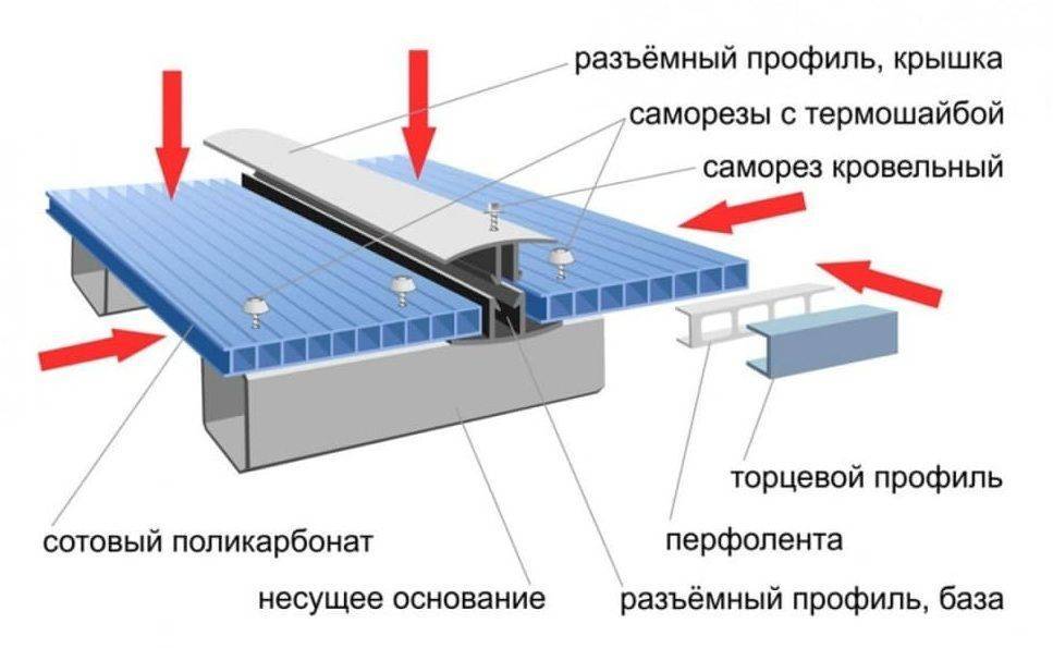 Такая оснастка компенсирует тепловые расширения поликарбоната и, заодно, перекрывает «мостики холода», которые образуются в шурупах. Вкручивание крепежных элементов без применения упомянутой выше фурнитуры – нарушение технологии, которое ведет к значительному снижению срока эксплуатации ограждения.