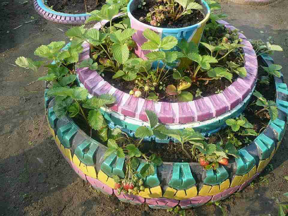 Из шин с обрезанными краями можно сделать высокую грядку для клубники