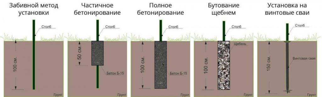 Столбы могут изготавливаться из кирпича, камня или бетона на бетонном фундаменте. Когда они выполняются из металлической трубы или деревянного бруса, то могут зарываться или забиваться в землю с уплотнением, а также укрепляться методом бетонной заливки. Шаг установки опор составляет 2-3 м в зависимости от общей длины и высоты забора, а также системы крепления досок.