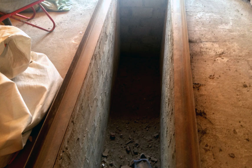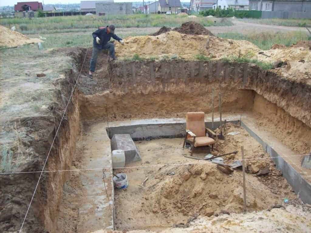 Но у такого варианта есть и плюс: закрытость строительной площадки. Крыша защищает яму от размывания дождем. Пол в помещении, как правило, представляет собой толстую армированную стяжку. При обустройстве ямы в этом случае создается разметка, а затем раздалбливается бетон. Арматурные хвосты обрезаются по периметру. Из получившегося котлована изымают почву и подушку из песка и гравия. Для этой операции используются обычные лопаты. Чтобы процесс шел быстрее, стоит пригласить помощника. Дно и стенки ямы нужно максимально выровнять