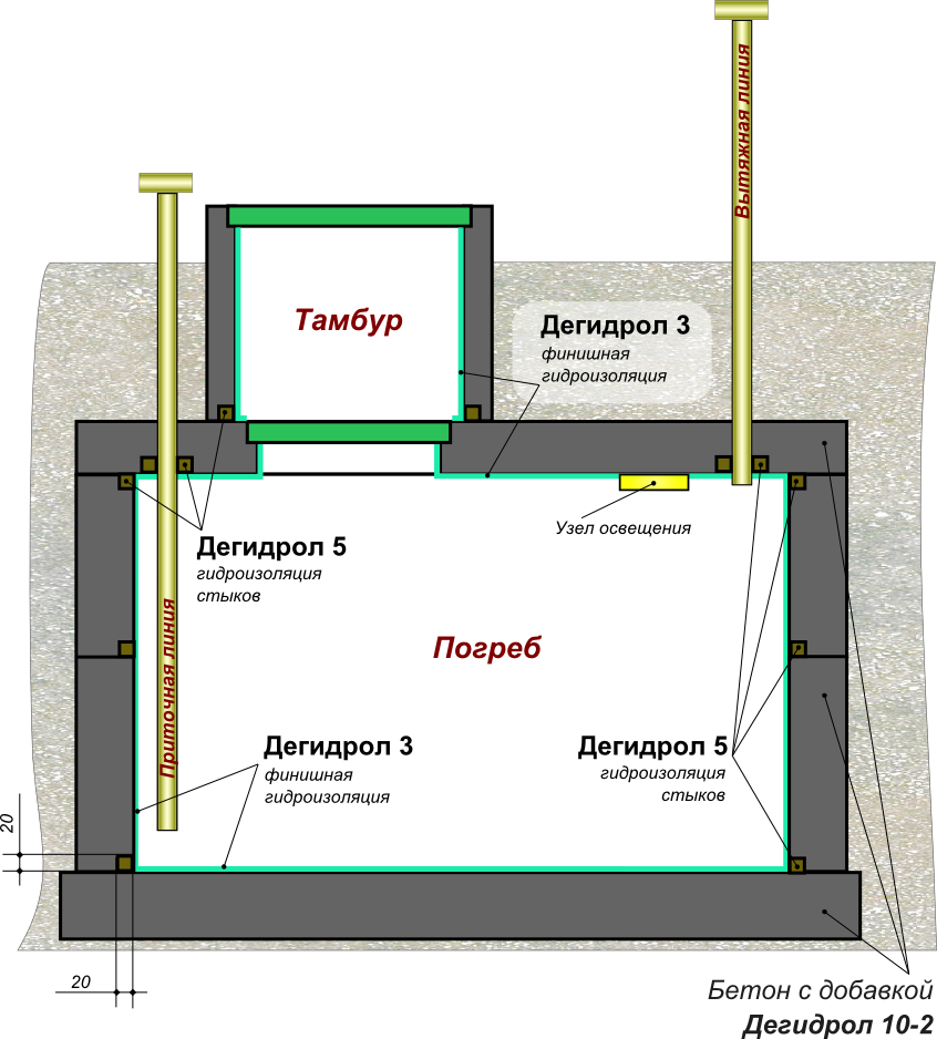 Полная температурная стабильность достигается на глубине около 3 м. Северо-восточное расположение входа также помогает сохранять нужные параметры. Надёжная гидроизоляция стен, пола, утепление потолка – аксиома.