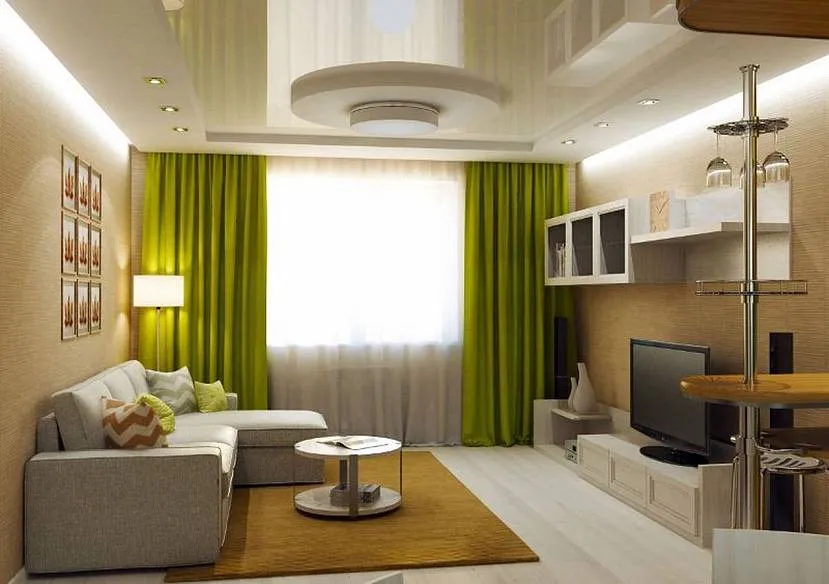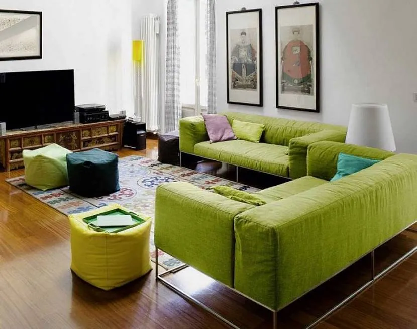 - Дизайн гостиной в светлом зеленом оттенке – исключительно спокойное, позитивное решение преимущественно для современного интерьера. Органичен он и для стиля эко. Такая обстановка получается уравновешенной и свежей. Травяной прекрасно сочетается с природной палитрой – с деревянными поверхностями темных оттенков, с малиновыми и синими тонами.