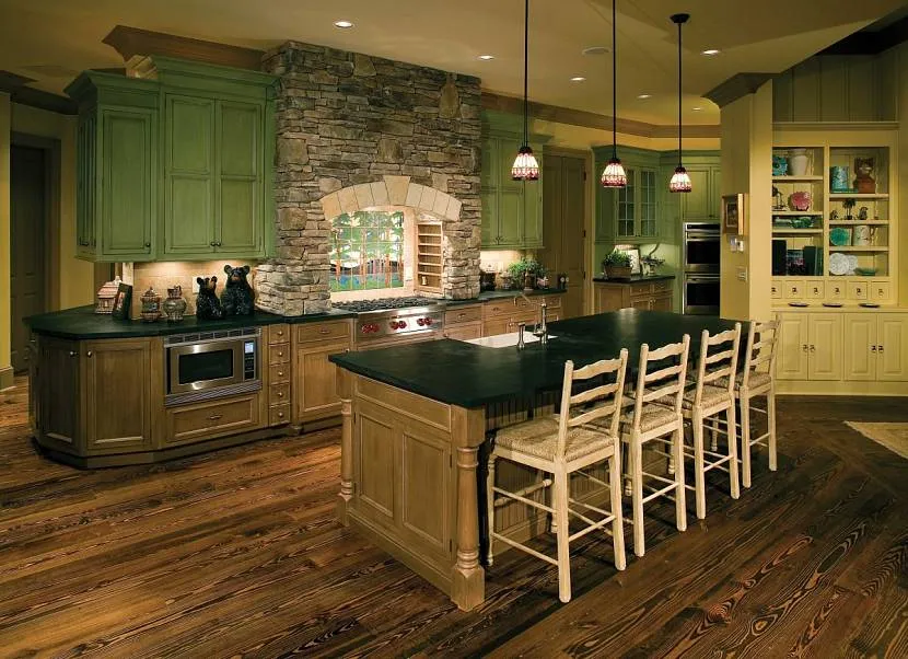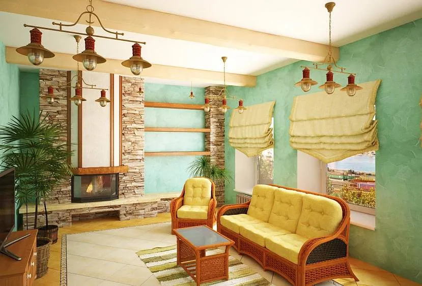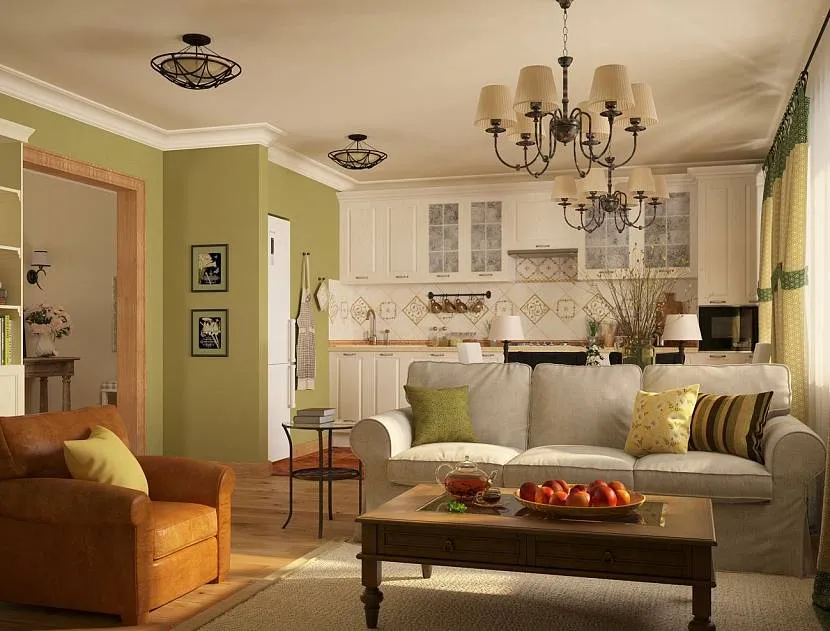 Деревенский стиль предпочитает яркие, сочные цвета – синий, оранжевый и красный. Фисташковый фон подчеркнет элегантность интенсивных оттенков, продемонстрирует преимущества пространства. Варианты приглушенного желто-зеленого используют в качестве рисунков на обоях и в декоре.