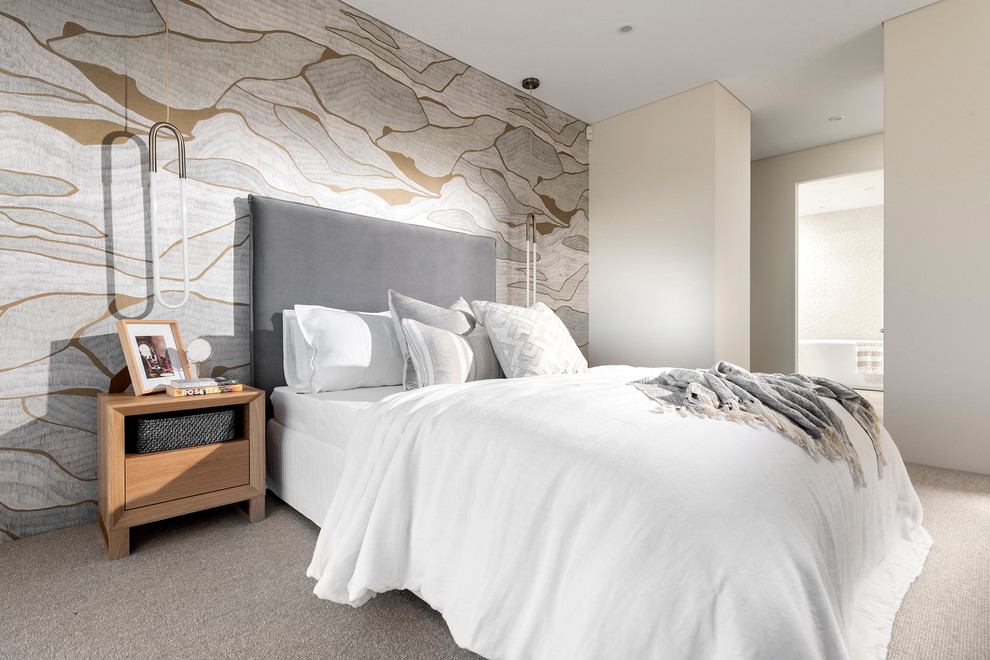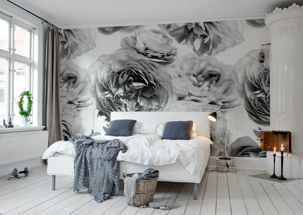Особенностью этого направления считаются белые стены, которые визуально расширяют пространство. Обои для скандинавской спальни выбирают однотонные либо с простым геометрическим рисунком.
