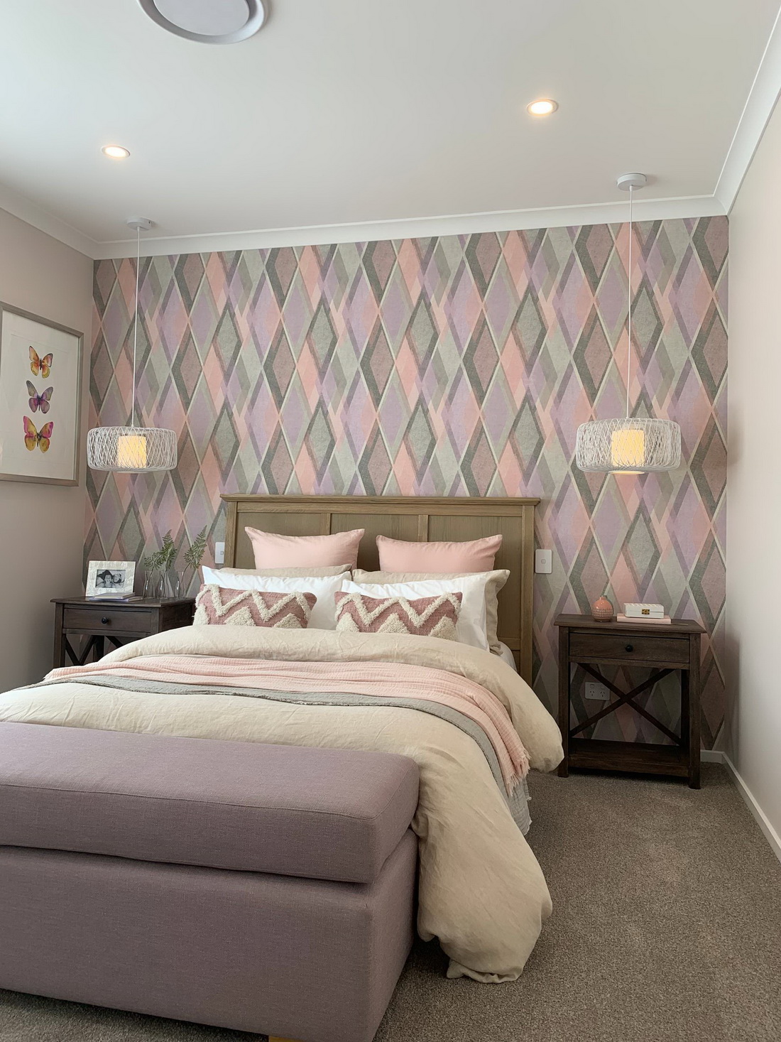 Оттенки этой гаммы создают в спальне особую интимную атмосферу. К тому же на таких обоях лучше смотрятся яркие декоративные акценты.
