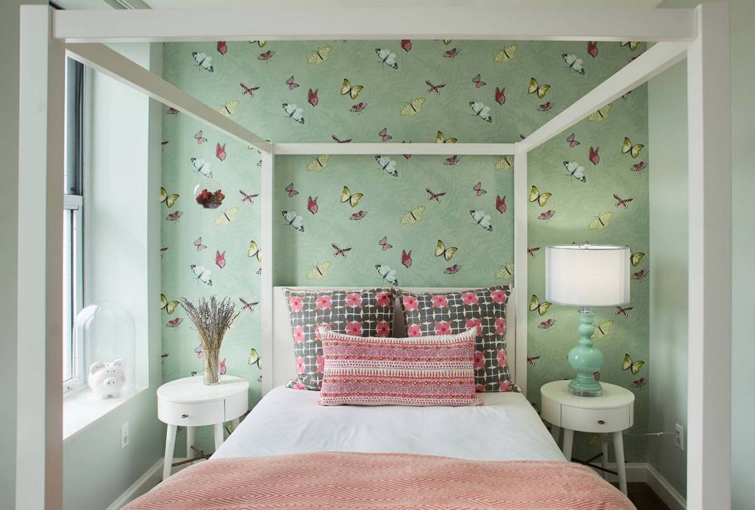 Здесь можно использовать флизелиновые обои под покраску. Одна стена, обычно это стена, у которой стоит кровать, оформляется в контрастный цвет, чтобы сделать акцент.