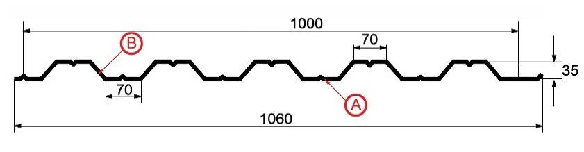 Этот параметр определяется волной профнастила и оказывает прямое влияние на рабочую ширину. К сведению, профлист устанавливается как вертикально, так и горизонтально. Способ установки не оказывает влияния на его прочностные характеристики.