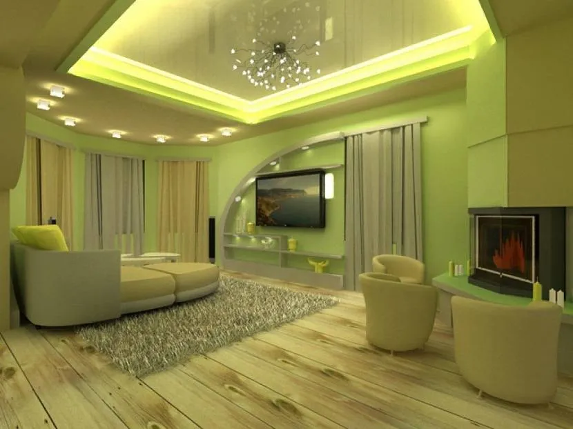 Поскольку зеленые обои в зале играют успокаивающую роль, не всегда такие оттенки считаются подходящими для оформления зон развлечений или приема гостей. Поэтому в зоне возле дивана или телевизора рекомендуется использовать насыщенные или яркие оттенки зеленого.
