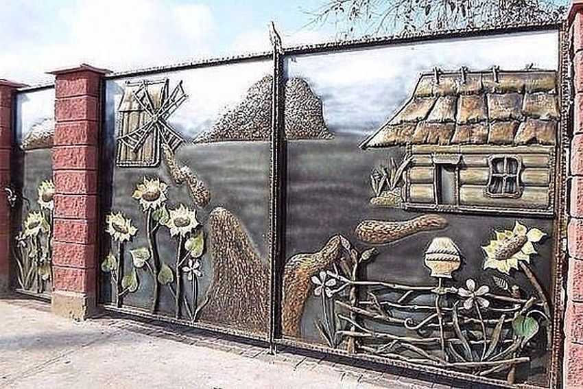 Данный тип ограждения можно смело наименовать бюджетным вариантом. Все элементы ковки — штампованные. Каркас и ребра жесткости выполнены из тучного металла, элементы штамповки также не отличаются изящностью и красотой. Концентрированные и мощные ворота выполняют свою основную функцию — защиту собственной территории.