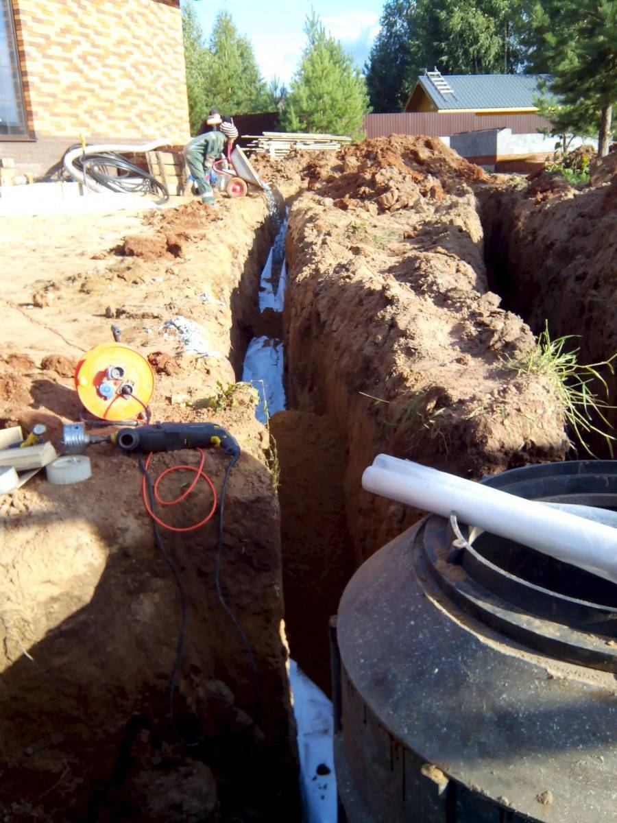 - Засыпка дна траншей слоем песка толщиной от семи до десяти сантиметров с последующей утрамбовкой.