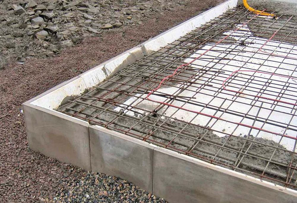 По периметру выкопанного под фундамент котлована устанавливается опалубка. Затем из арматурных прутьев формируется каркас и заливается бетонный раствор