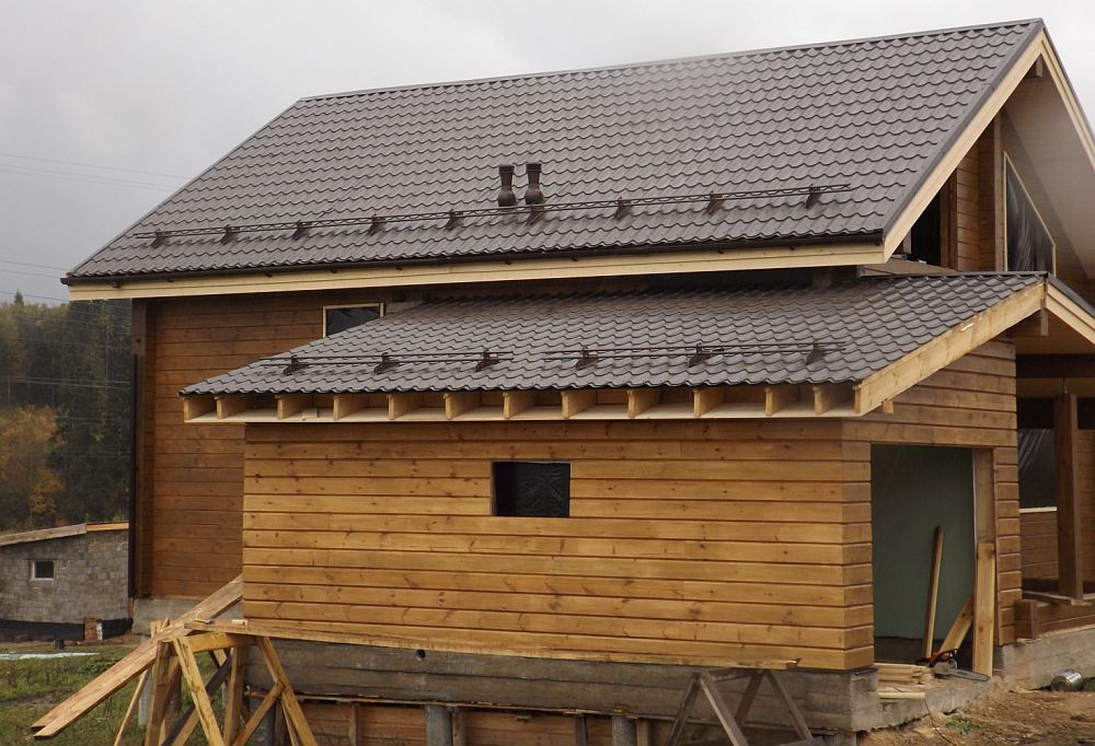 Для покрытия крыши при строительстве пристройки своими руками следует использовать гибкие материалы (профнастил с высотой сечения менее 10 мм, мягкую черепицу).