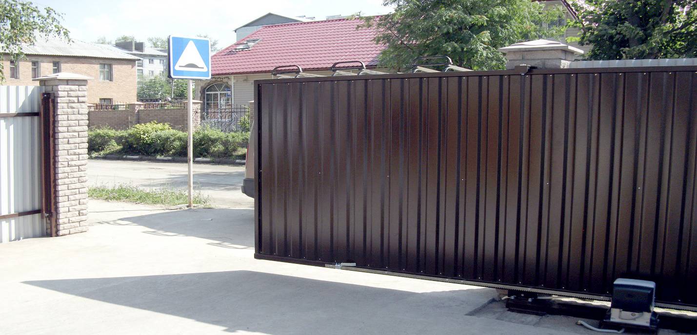 Довольно распространенные механизмы, работающие за счет передвижения створок на роликах по встроенным вдоль забора рельсам. Крепление откатных ворот к кирпичным столбам лучше предоставить специалистам, хотя при должной подготовке можно справиться своими силами. Конструкция сложная, но при этом функциональная. Единственное, что следует учитывать сразу, рельсы размещаются вдоль забора на всю длину створок и требуют периодической очистки от попадающего мусора. Полотно представляет собой металлический каркас, обшитый выбранным материалом. Чаще всего используется профильный лист.