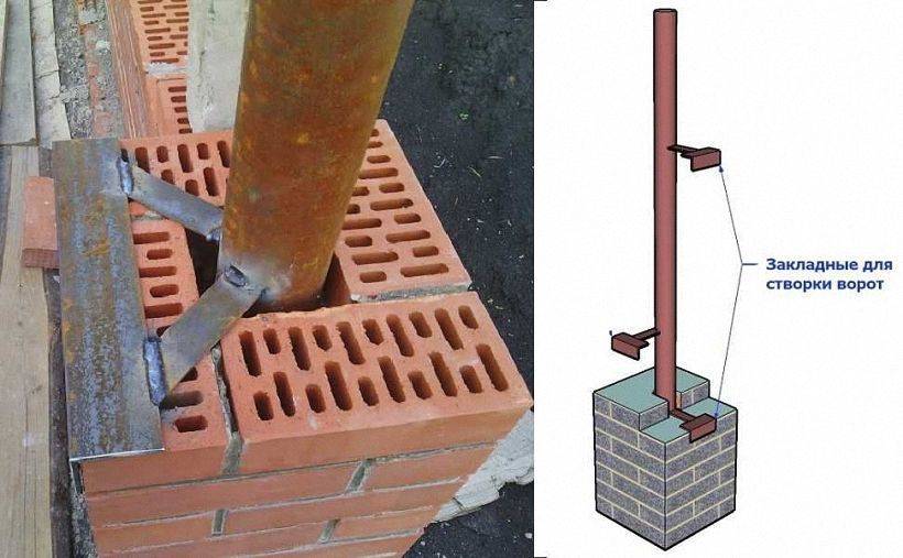 Одной из характерных ошибок, когда изготавливается кирпичный столб, является вставка стального стержня только внутри него. В результате она становится абсолютно бесполезной. Чтобы сделать крепление столбов ворот, невозможно обойтись без профильного материала: