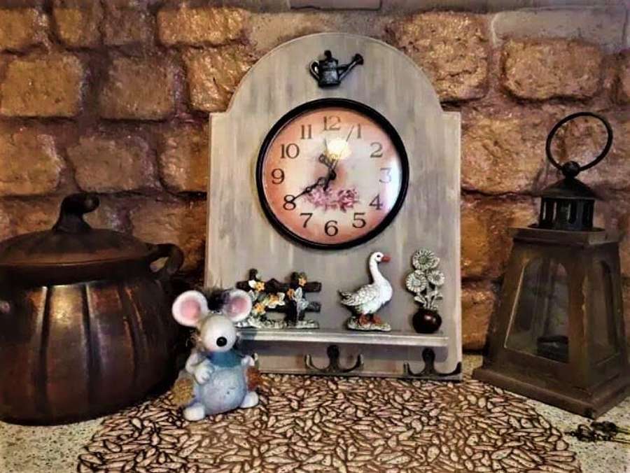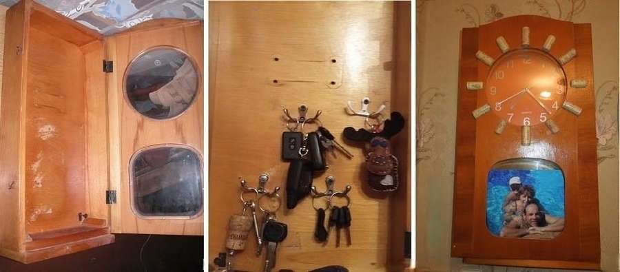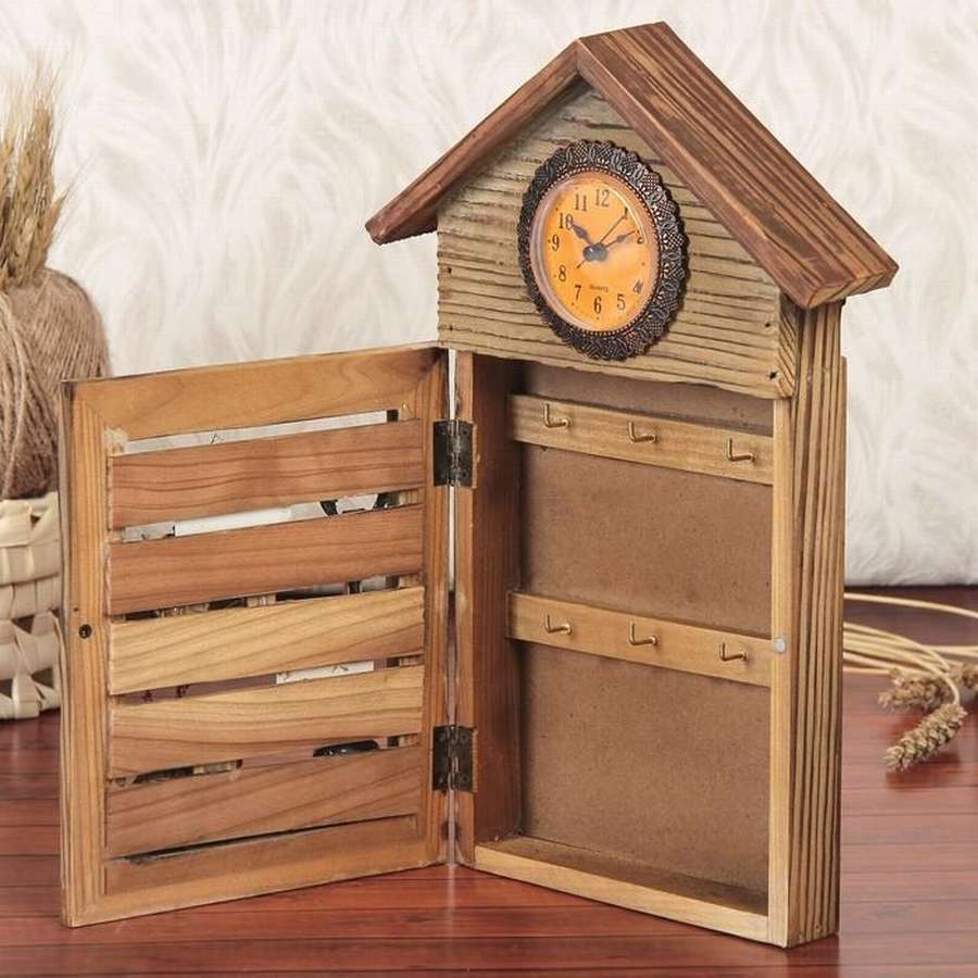 Ключница домик из старых, вышедших из строя часов напоминает шкафчик для ключей. Оформление специально разработано так, чтобы иделие вызывало воспоминания о советских мастерах.