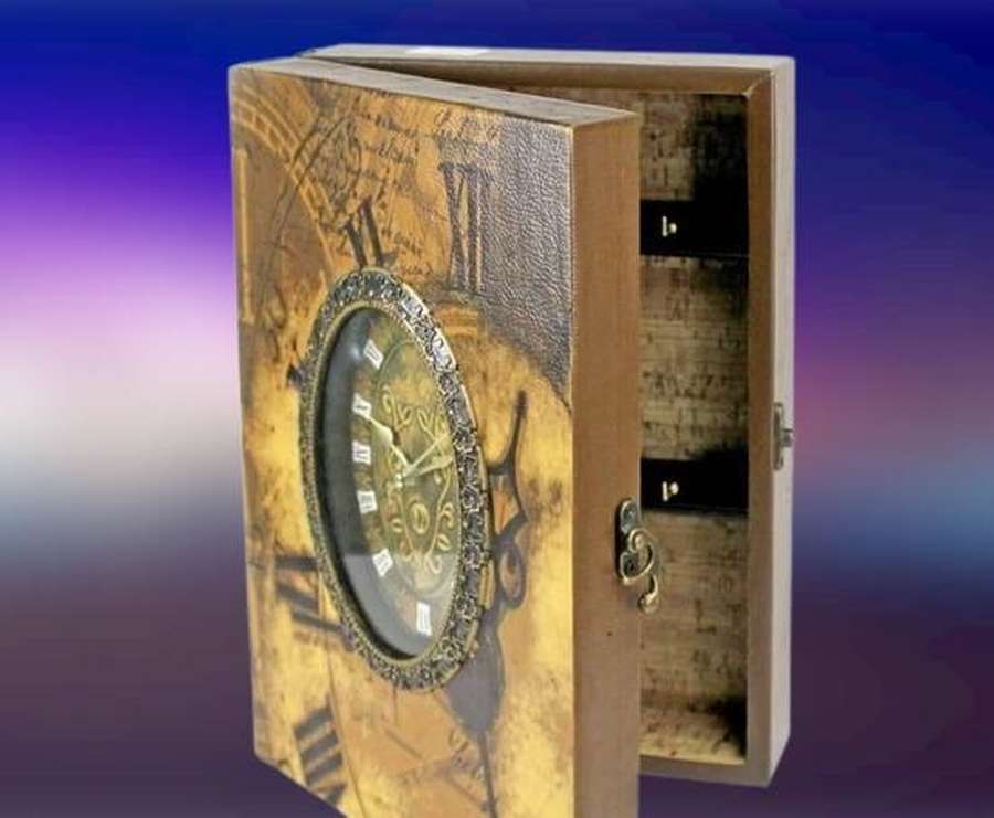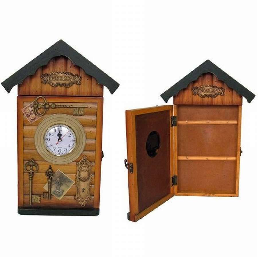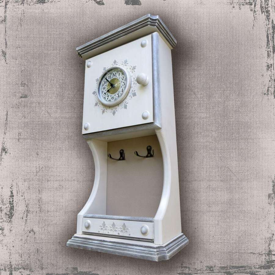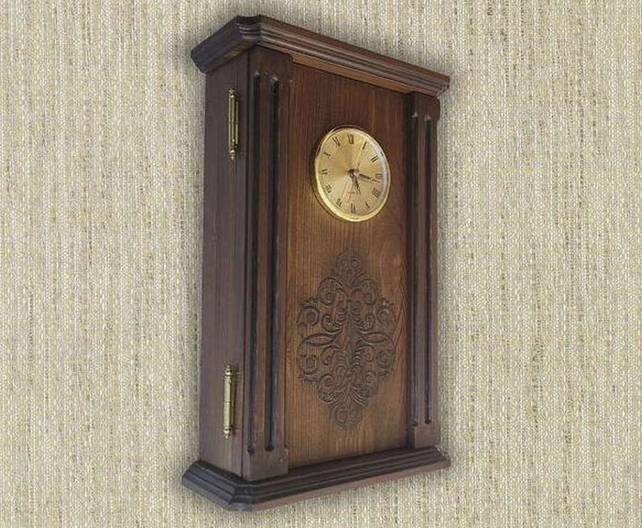 Закрытая настенная ключница шкафчик с часами и красиво оформленной дверкой.