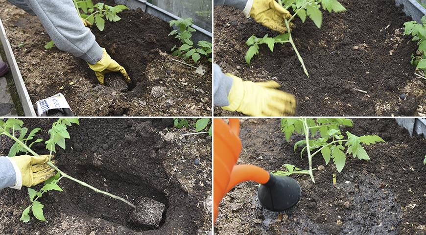 Не ставьте рассаду в лунки, а укладывайте ее под углом примерно 45 градусов. Томаты легко дают корни и это позволит им получить дополнительное питание.