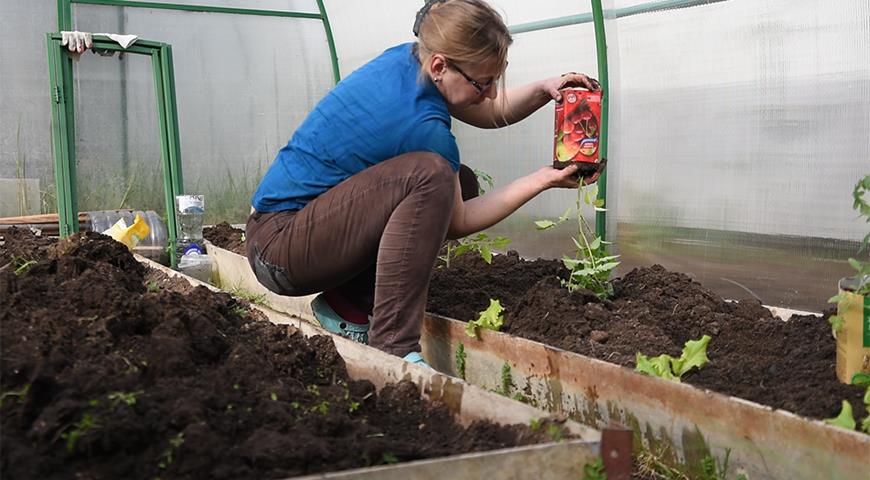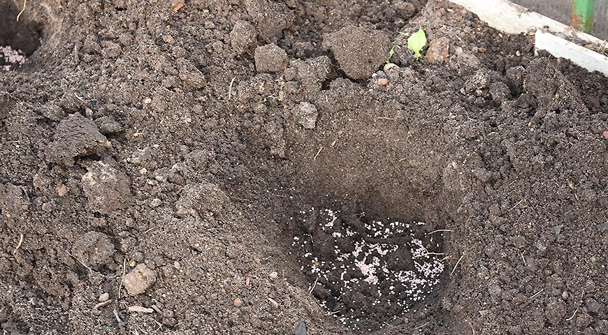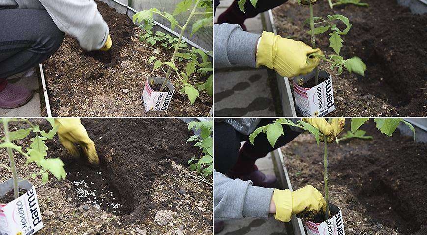 3. В каждую лунку добавьте комплексное минеральное удобрение (можно специализированное для томатов, можно универсальное), хорошо перемешайте его с грунтом и полейте лунки до состояния грязи.