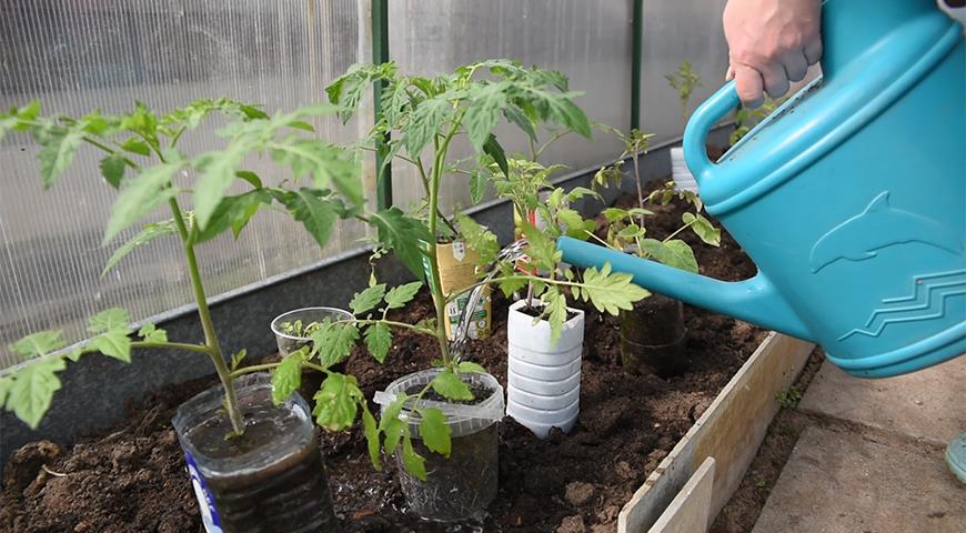 После высадки помидор в теплицу, спустя неделю-полторы, полейте посадки. Используйте воду температуры не холоднее 21 градуса. Направляйте лейку под корень так, чтобы влага меньше попадала на листья помидорных кустов.