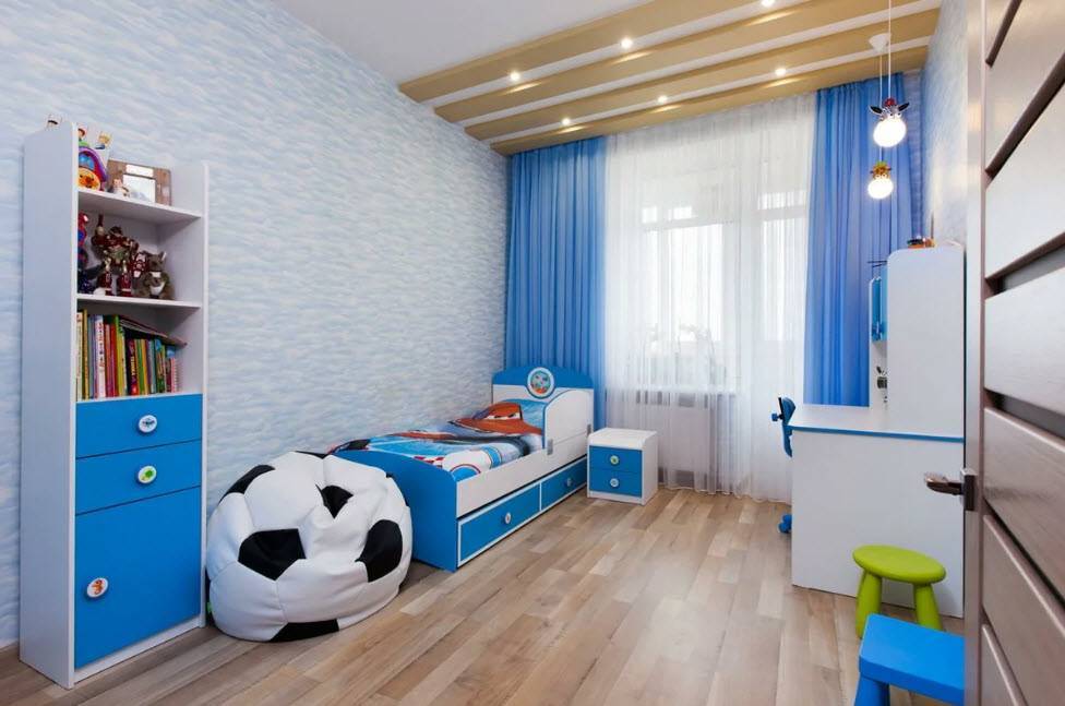 - Сине -голубая. Это цветовое решение считается традиционным при оформлении помещения для представителей сильного пола. Успокоить гиперактивность мальчиков поможет синий цвет, так как он благоприятно и успокаивающе действует на психику человека. Голубой и синий цвет не отвлекает малыша от выполнения школьных заданий. Для того чтобы освежить интерьер детского помещения в синем цвете можно использовать различные оттенки синего и голубого. Такой ход поможет выполнить удачно зонирование детского пространства.