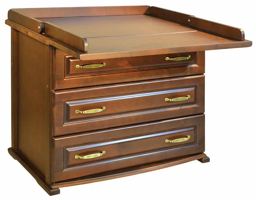 Для таких комодов характерны цвета: белый, бежевый, голубой, розовый с фасадом украшенным рисунком или орнаментом. Их изготавливают из натурального массива дерева.