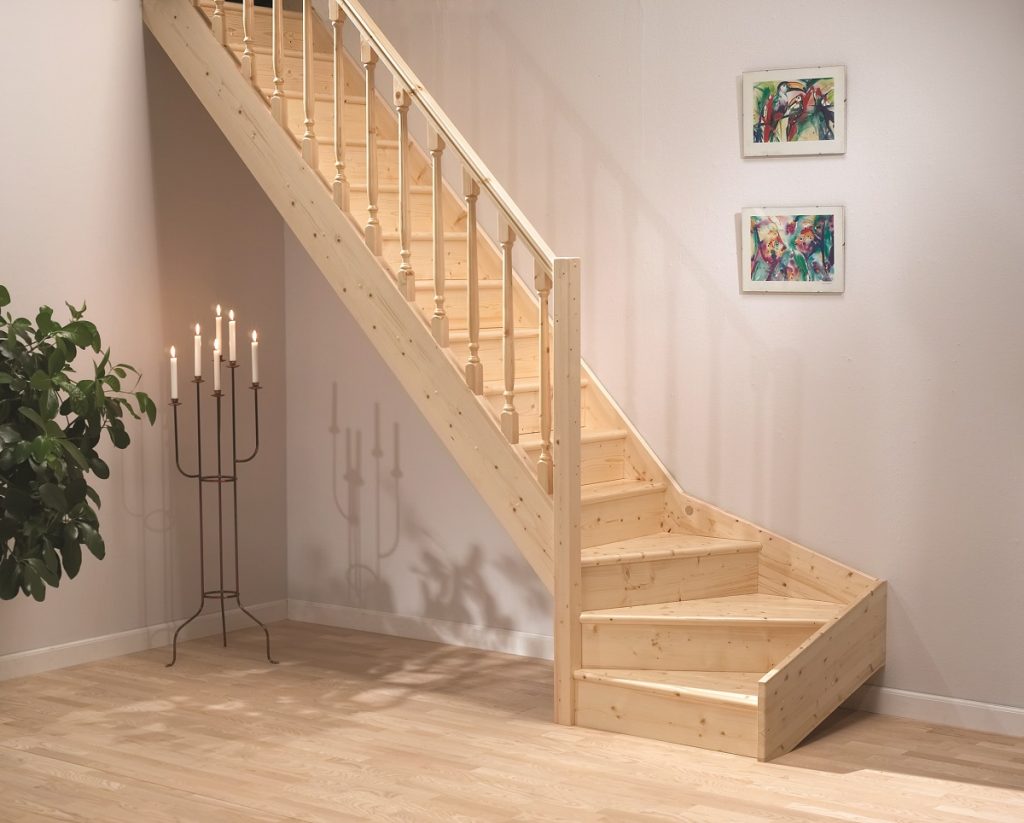 Модели с поворотами маршей устанавливают в углу или у стены. Площадки в них играют роль элемента, необходимого для разворота. Повороты выполняют на 90° или 180°. Двухмаршевые лестницы не занимают много места, но подниматься и спускаться по ним достаточно удобно. Забежные ступени в таких случаях просто незаменимы. Минимальное занимаемое место при 3-метровой высоте этажа — 160х180 см.