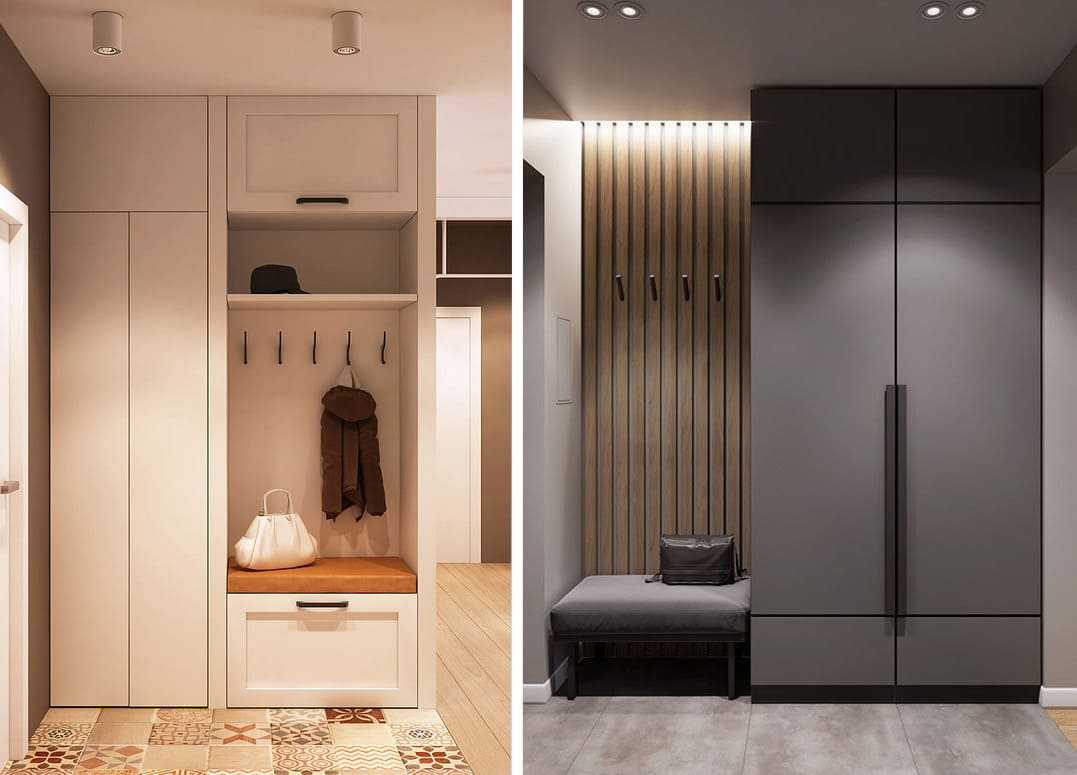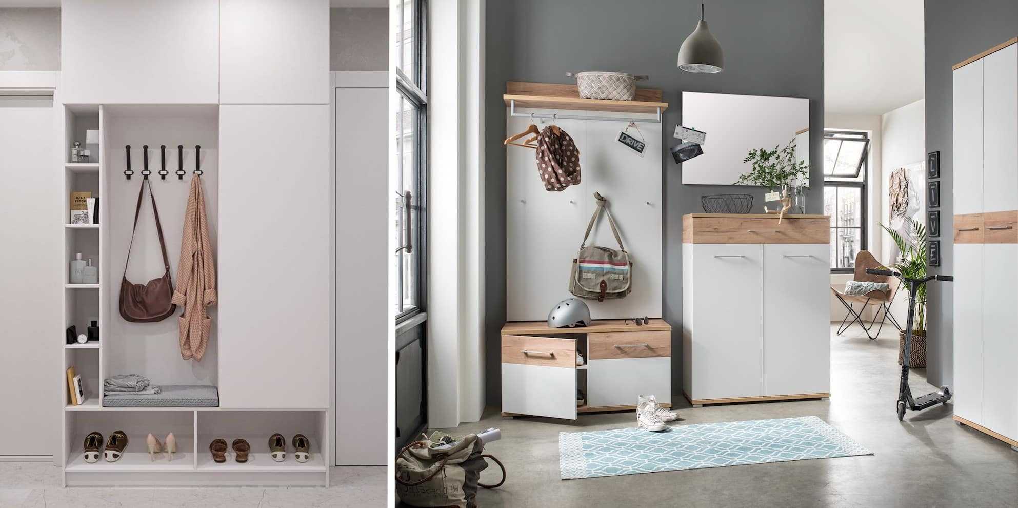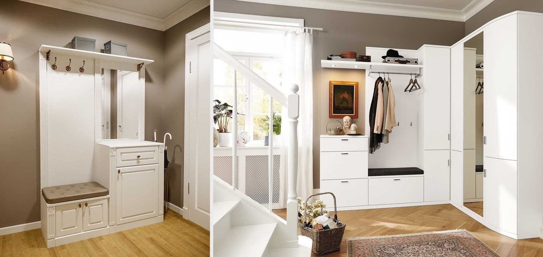 Навесные модели практичны. Напольные стойки размещают в любом месте коридора. Встроенная мебель значительно экономит место.
