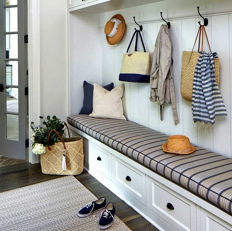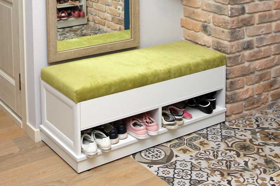 Для удобства в коридоре должно быть специальное сиденье. Эту роль может сыграть пуфик, скамейка, небольшой диванчик. Для маленькой прихожей идеально подойдет обувной шкаф с мягким сиденьем.