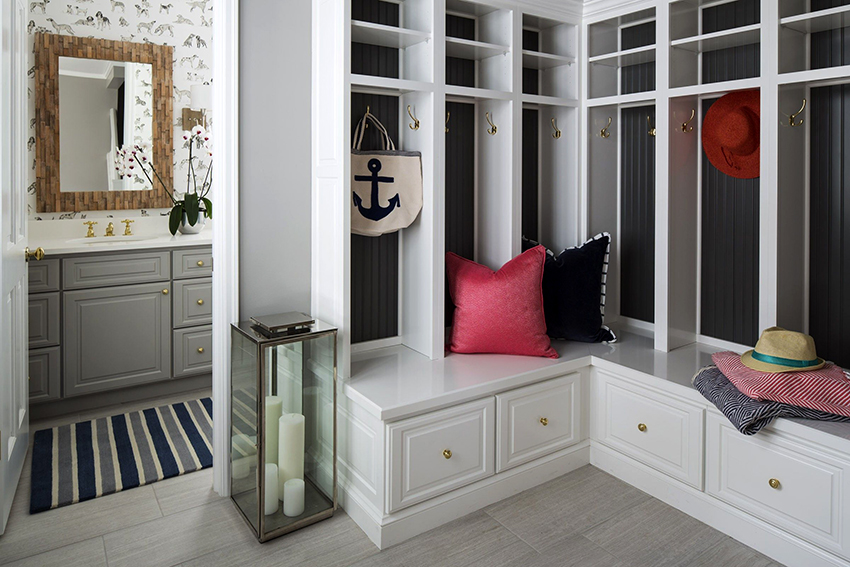 Если квартира или дом двухэтажные, лестницы часто размещают на территории прихожей. Пространство под ступеньками не должно простаивать, там много ценного места для полок, крючков или вешалок.
