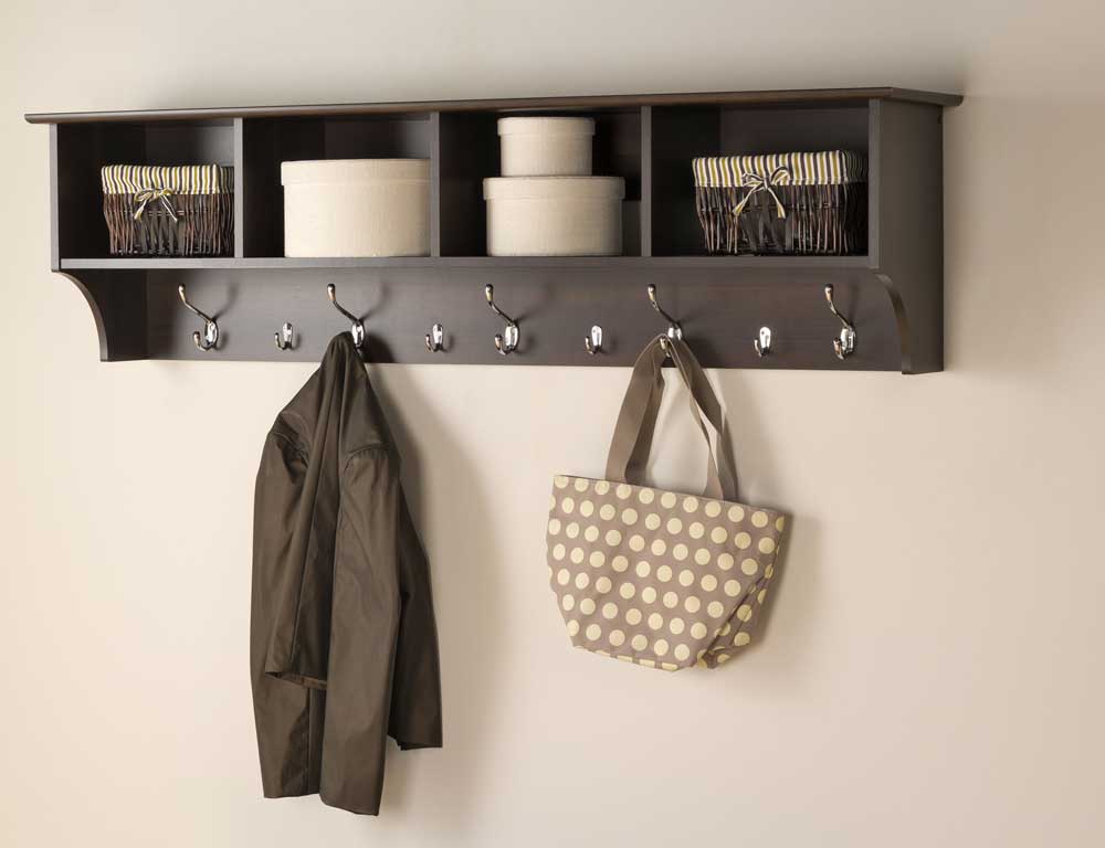 Без полок в прихожей не обойтись. Они могут быть отдельными элементами или частью мебели. Вешалка для верхней одежды — один из наиболее практичных вариантов. На крючки вешают одежду и зонтики, сверху находятся головные уборы. Прикрепите конструкцию на стену ближе к выходу.