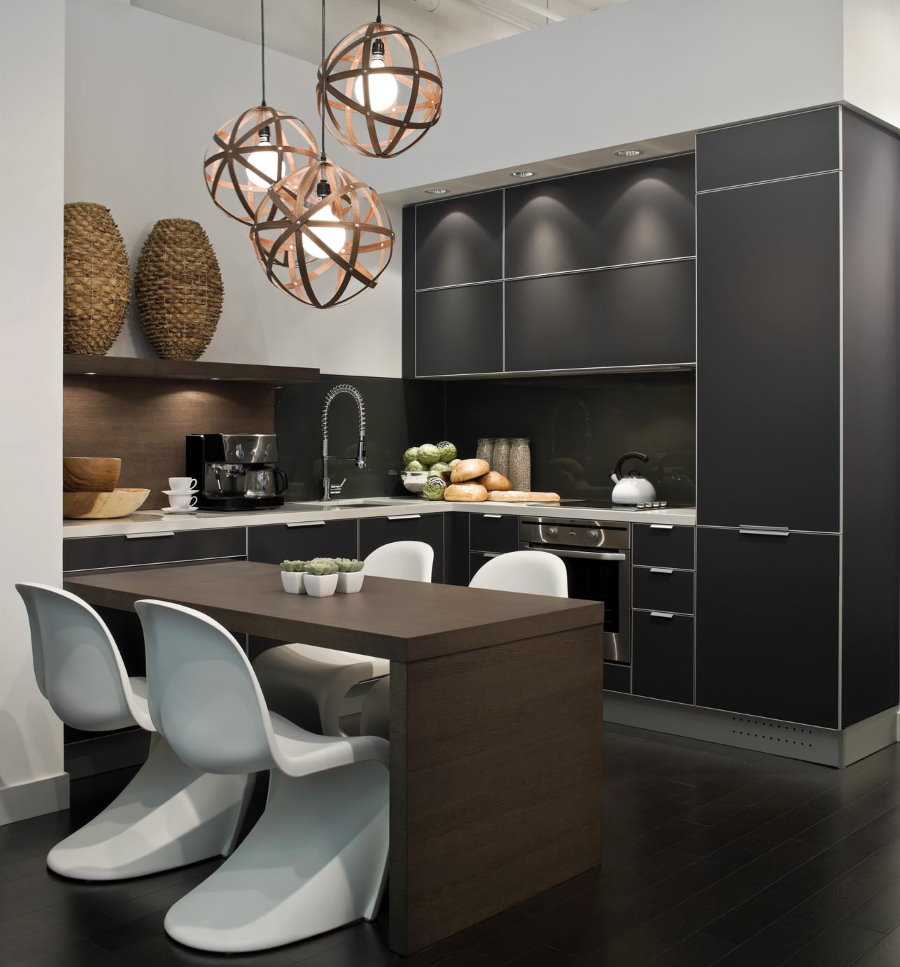 Что касается освещения, в современном стиле приветствуется большое количество естественного света. Если такой возможности нет, устанавливается большое количество небольших светильников по всему периметру. Такое решение делает даже маленькую комнату более просторной и яркой.