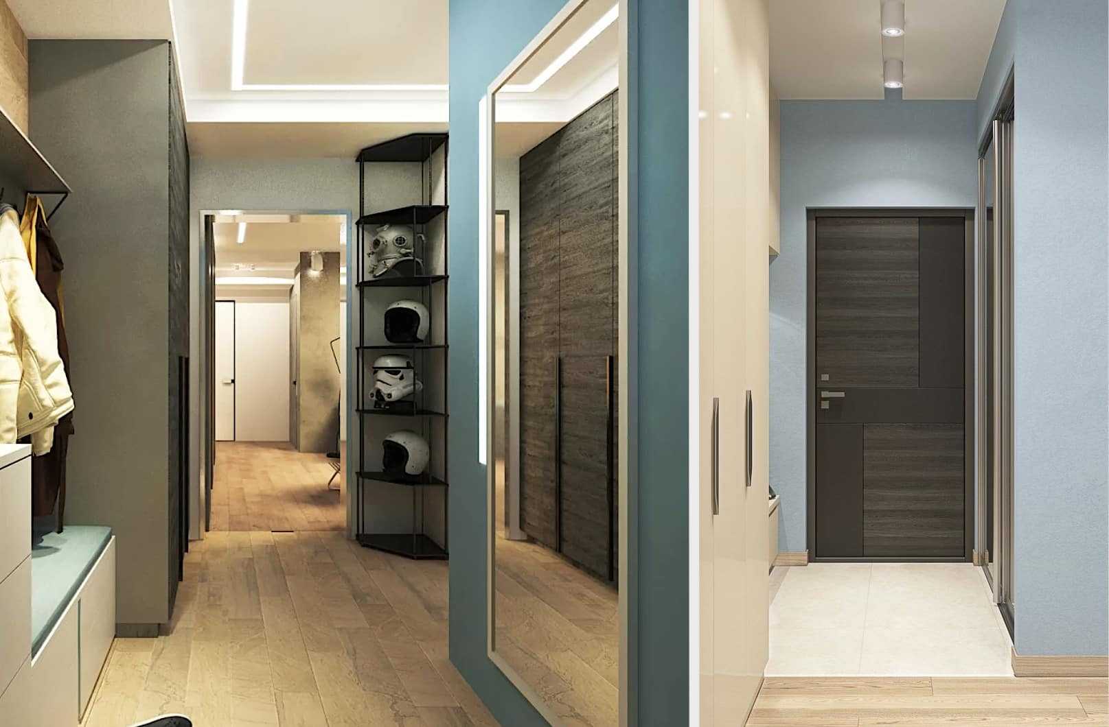 Основная проблема такого помещения — невозможность нормально расставить мебель. Помимо компактной меблировки стоит решить, как выровнять пропорции коротких стен с длинными. Если коридор сильно вытянут, одну его часть можно отгородить, создав там гардеробную или кладовку. Кроме перегородок для этой цели можно использовать визуальные приёмы — уровни на потолке, либо разные цвета отделки.