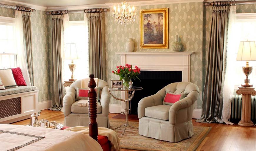 - Наличие рисунков на обоях исключает цветные занавески, а для однотонных стен портьеры с рисунком вполне подойдут.