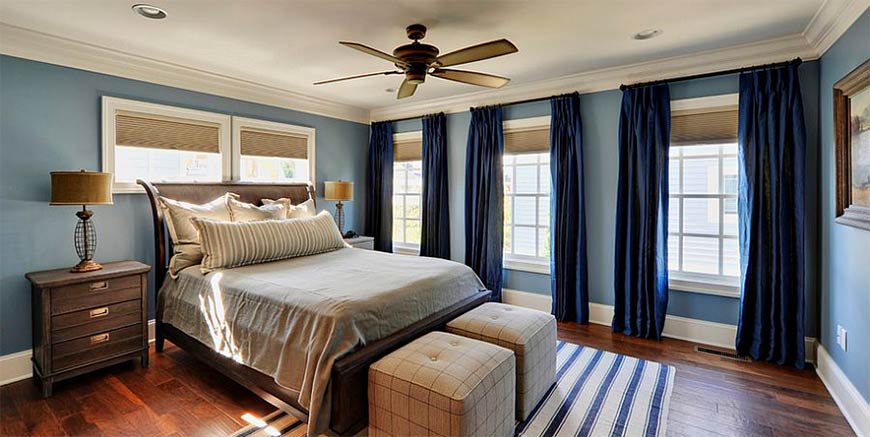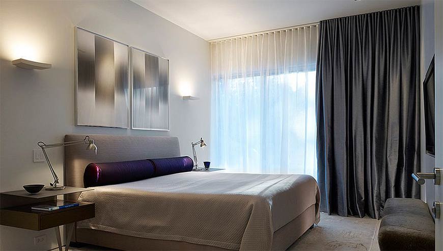 Затенить спальню можно плотными портьерами. Для этого подойдут классические модели штор. Двойные шторы также помогут в затенении. Обычно они шьются на подкладке. Они очень эффективны, но для их использования нужно покрепче закрепить багет.