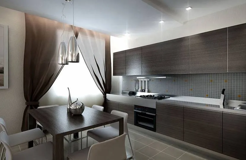 Также дизайнеры рекомендуют не забывать об использовании симметрии при размещении занавесок, то есть можно использовать не только короткие шторы, но и длинные, а точнее – совместить их. Это поможет визуально увеличить пространство маленькой кухни. Смотреться будет довольно оригинально и современно, особенно если кухня оформлена в стиле хай-тек.