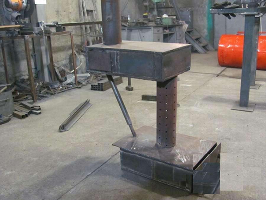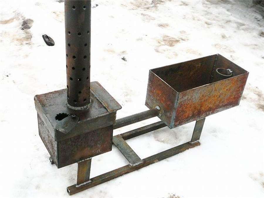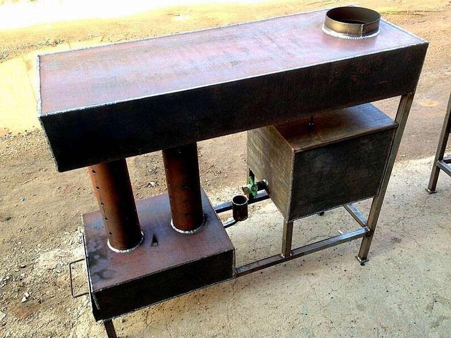 Печь на отработке выполнена из металлического квадратного ящика. Конструкция стоит на ножках из профильной трубы, прикрепленной к железному прямоугольному листу.