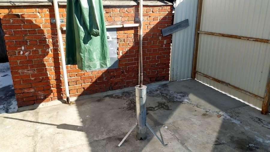 Компактная печь на отработке может быть выполнена из старой металлической трубы и трубы диаметром поменьше. Стоит такая небольшая конструкция на каркасе из профильной трубы.