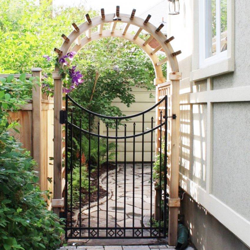 Закрытый тип кованой калитки не дает посторонним заглянуть на участок