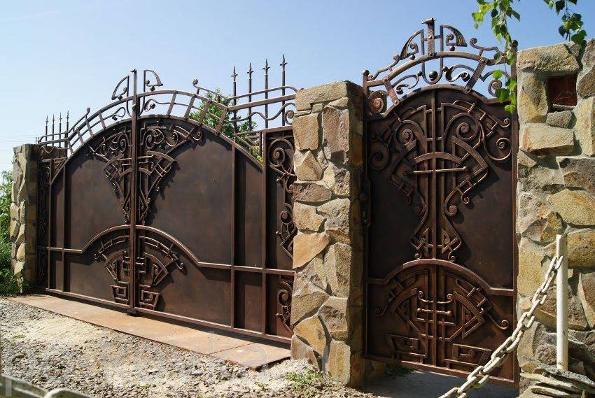 Распашные ворота и калитки опираются на столбы. Их практичность гарантируется тем, что они не занимают много места. На дверцах располагаются различные декоративные украшения – виноградная лоза, розочки, листики клена и т. д. Также на них устанавливают кованые детали, которые придают объем конструкции.