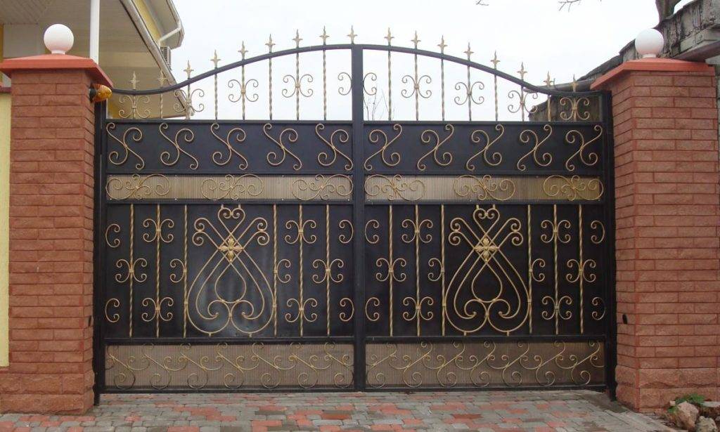 Некоторые модели ворот дополнены глухими листами железа, поверх которых прикреплены украшения из кованых элементов. Глухие ворота с элементами ковки выглядят красиво и закрывают обзор участка со стороны улицы.