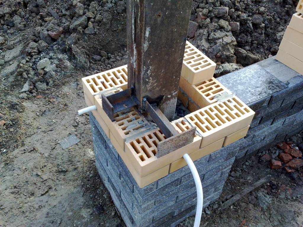 Укрепленные столбы требуется обложить кирпичом. Кладка кирпичей проводится с помощью кельмы. Вертикальные швы между кирпичами не должны граничить.