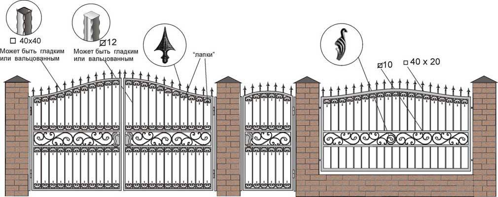 В первую очередь следует рассмотреть конструкцию самых простых вариантов, которые могут быть использованы для формирования ограды участка. Схему ворот нужно сделать заранее. Размер профилированных труб для несущих столбов должен быть не менее 60х60 мм, для створок — 40х40 мм.