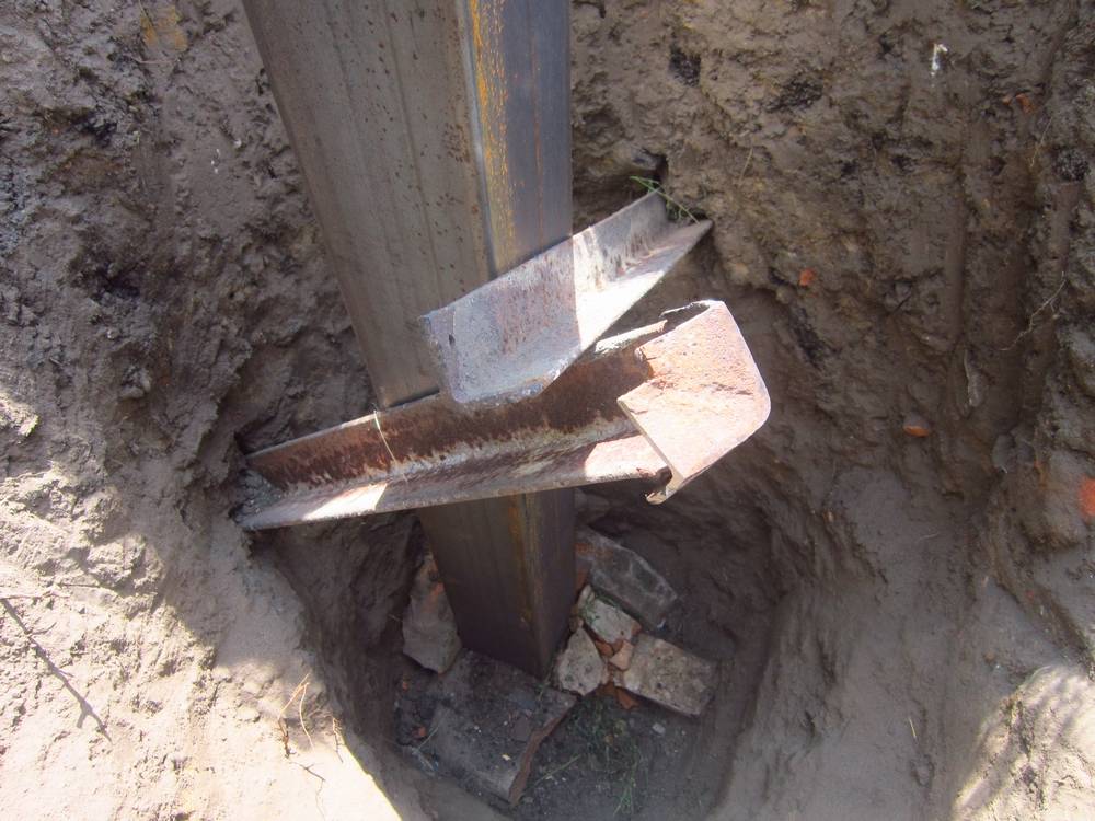 - По дну канавы установить арматуру из дорожной сетки 50х50 мм и перемычку из любого металла между столбами, которую необходимо приварить к ним.
